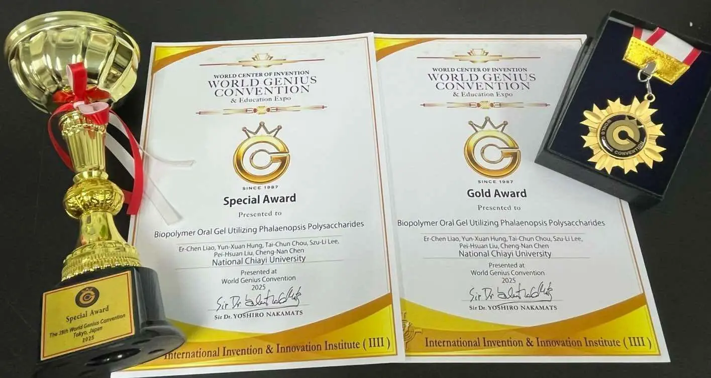 【記者張文一嘉義報導】隨著全球對綠色科技與精準健康的關注持續升溫,嘉義大學生化科技學系「中草藥綠色萃取技術團隊」再傳捷報!由陳政男教授指導的學生創新創業團隊,憑藉研發成果「口腔黏膜炎修護水凝膠」,勇奪2025年日本東京創新天才國際發明展金獎,更榮獲主辦單位評選為大會特別獎,成功將臺灣藥用植物的應用技術推向國際舞台。