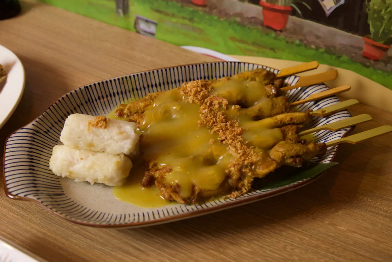 另有「巴東牛肉湯」以香料牛肉湯搭配馬鈴薯餅,口感溫潤;「沙嗲雞肉串」使用醃製雞肉串炭烤後淋上特製咖哩醬,香氣撲鼻;「烤蝦串」則以新鮮白蝦醃製後炭烤,搭配金桔與辣椒醬,展現濃郁海味。