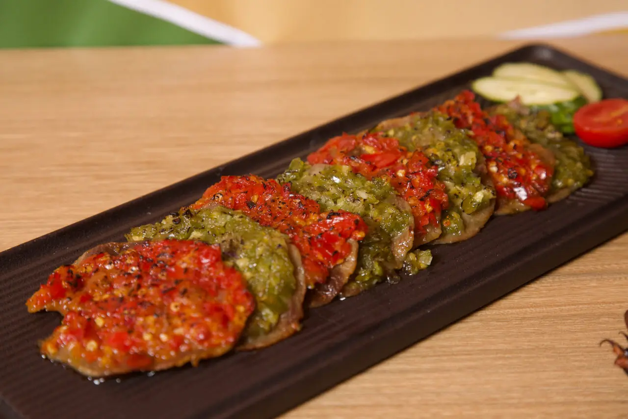 蔬食方面,「Gado-Gado花生醬沙拉」結合多種蔬菜、水煮蛋與豆腐,佐以濃郁花生醬,清爽可口;「雙醬牛肉」以煎製微焦牛肉搭配紅綠雙色辣椒醬,呈現鹹香多層次口感;甜點「Onde-onde炸芝麻球」外酥內糯,包裹綠豆餡,為印尼傳統甜點代表;另有「印尼炙烤牛肉沙嗲」,採用香料醃製牛肉切片炙燒,香辣中帶有炭香。