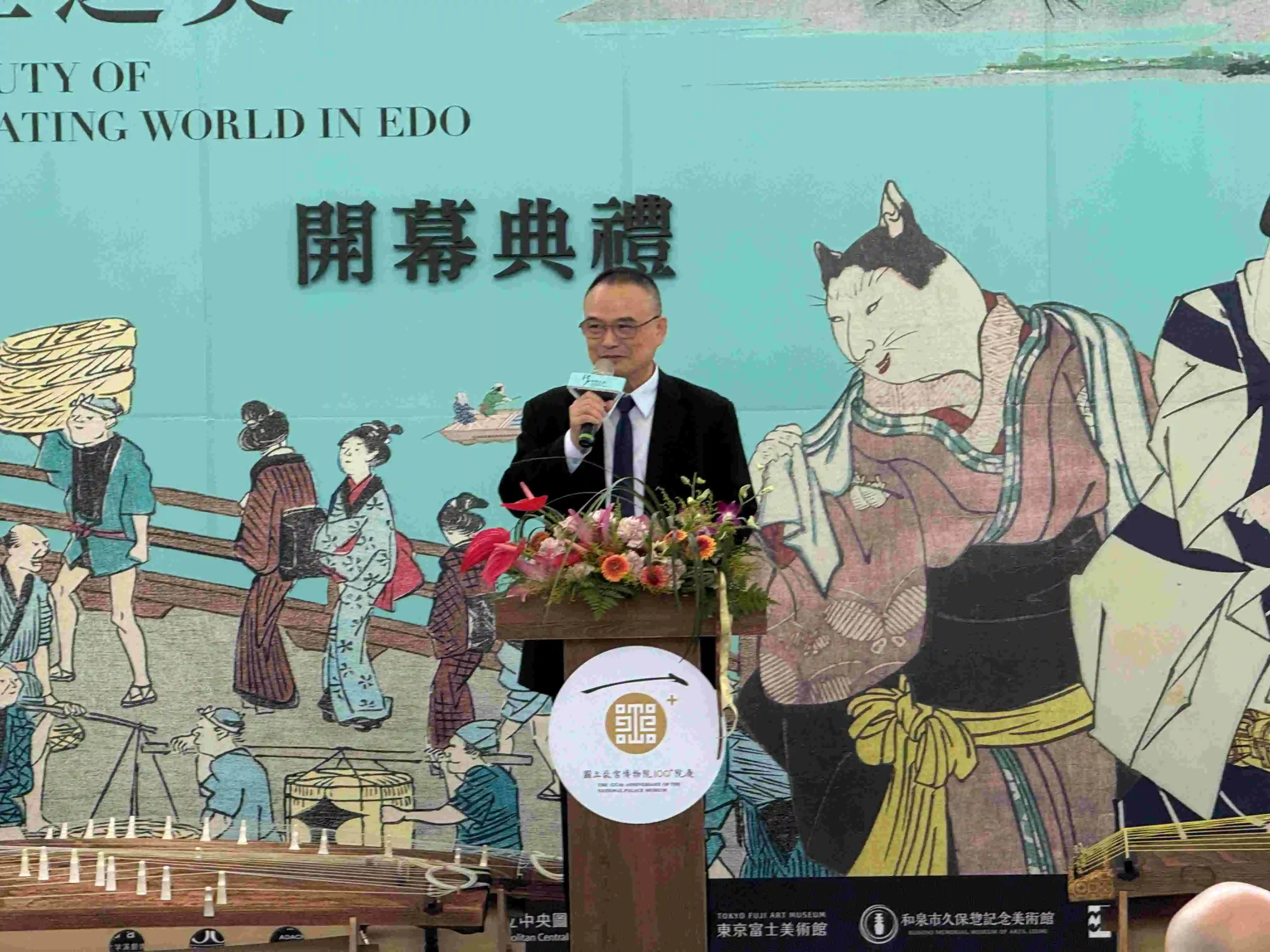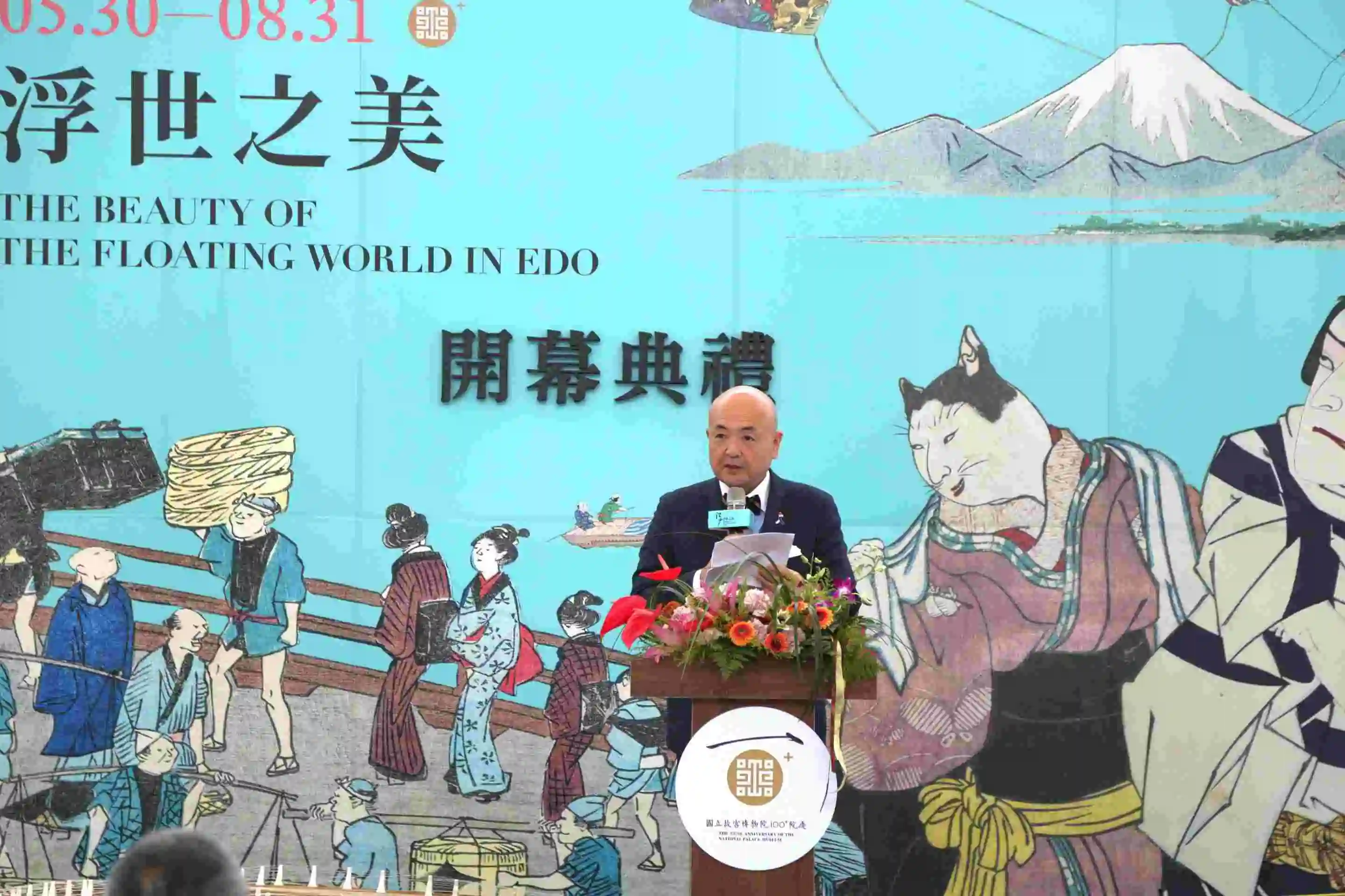 日本台灣交流協會片山和之代表致詞表示,能於故宮百年時受邀參加「江戶浮世之美」特展開幕感到很榮幸,期待大家在本展覽中發掘江戶時代的充沛活力。片山代表認為臺灣與日本多年來能建立深厚的友誼,基礎在於雙方文化藝術的交流頻繁,期待未來能持續更多交流。 嘉義縣長翁章梁也蒞臨現場致詞,他說連梵谷作品都受到日本浮世繪影響,本展覽非常值得大家抽空前來觀展。翁縣長同時歡迎日賓們到嘉義阿里山等地走走,也邀請日本朋友務必品嚐臺灣第一名的嘉義咖啡。