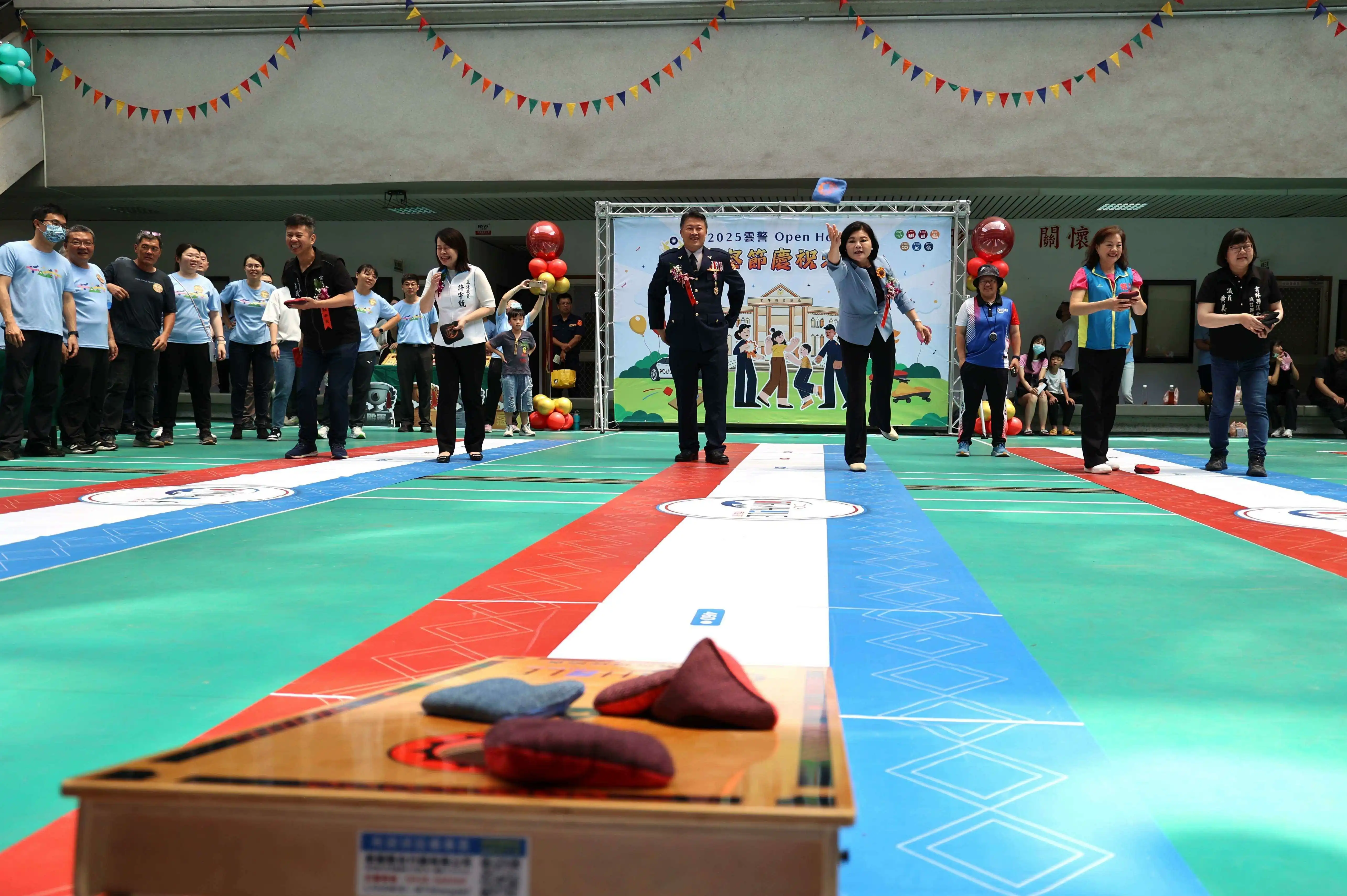 另外,縣警局中庭則進行「布袋球競賽」,包括張麗善縣長、許宇甄立委、多位縣議員及李建民局長均下場體驗;另還安排「扭扭車大賽」,平日嚴肅拘謹的警察同仁今都放下身段騎乘兒童滑步車爆笑登場,笑聲連連、氣氛熱鬧滾滾;而各分局也在展現團隊默契與活力,將整場活動氣氛推向最高潮,處處可見笑聲與溫馨互動,成功展現警察親民形象,也為警察節注入滿滿溫暖與活力。