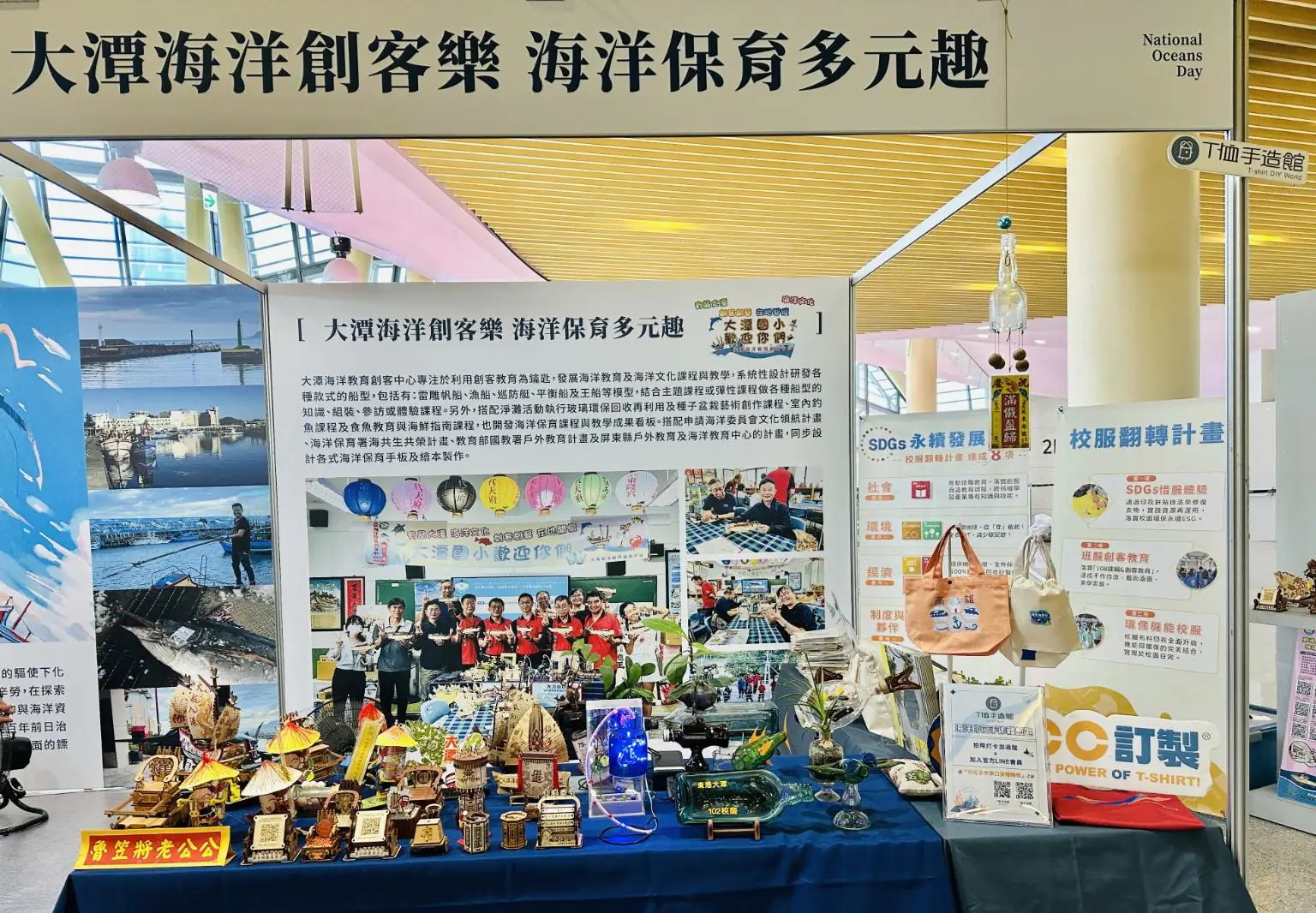 T恤手造館團隊表示,這次很榮幸能參與國家級的國家海洋日,在展示當天感受到活動現場學生及民眾的熱情與回響。這次應屏東縣大潭國小趙錫清校長之邀,進駐設攤推廣環境永續與創客教育,與師生及民眾一同以「印花 × 永續 × 教育」的創意手作體驗,共築永續藍色地球。