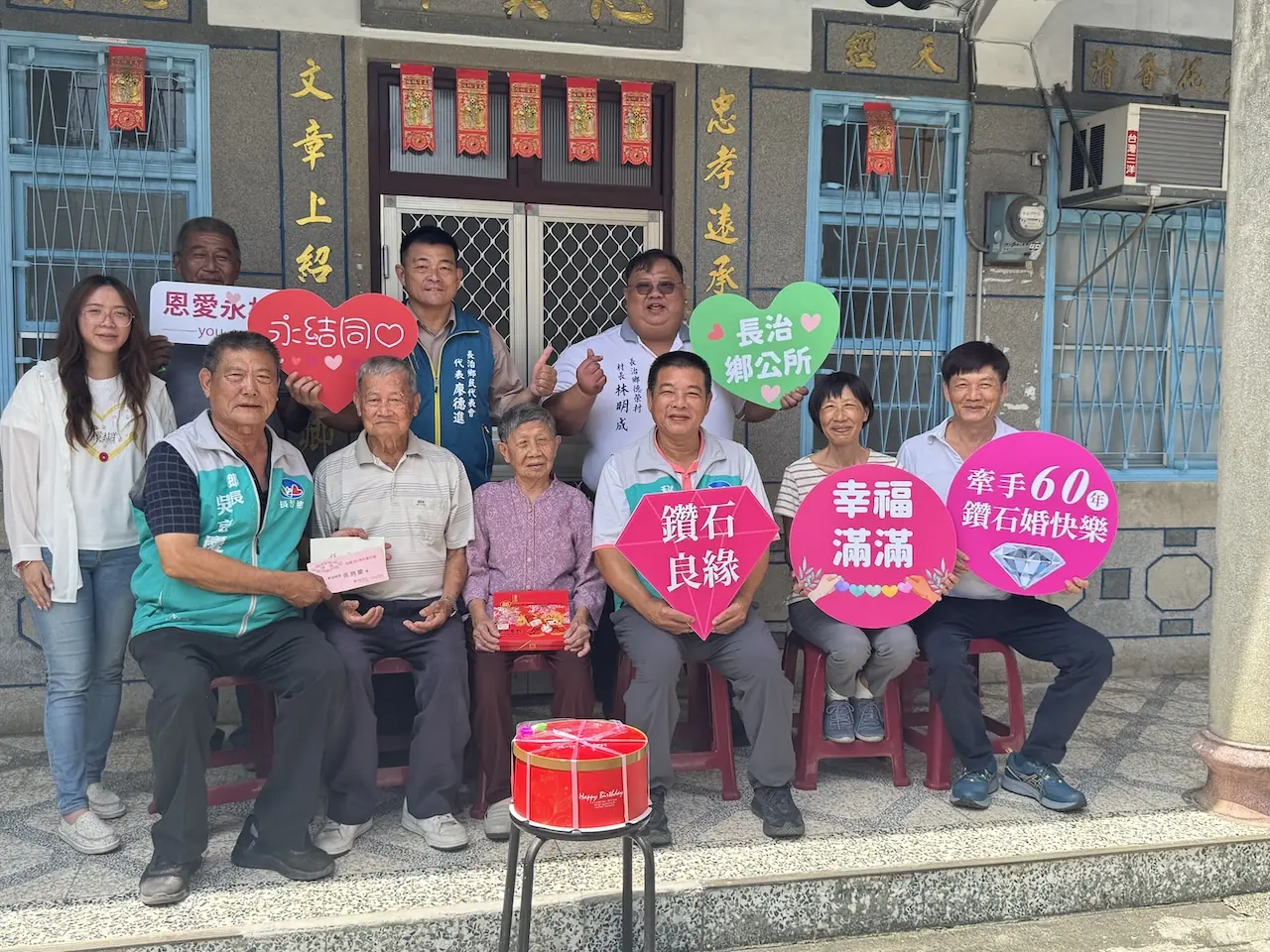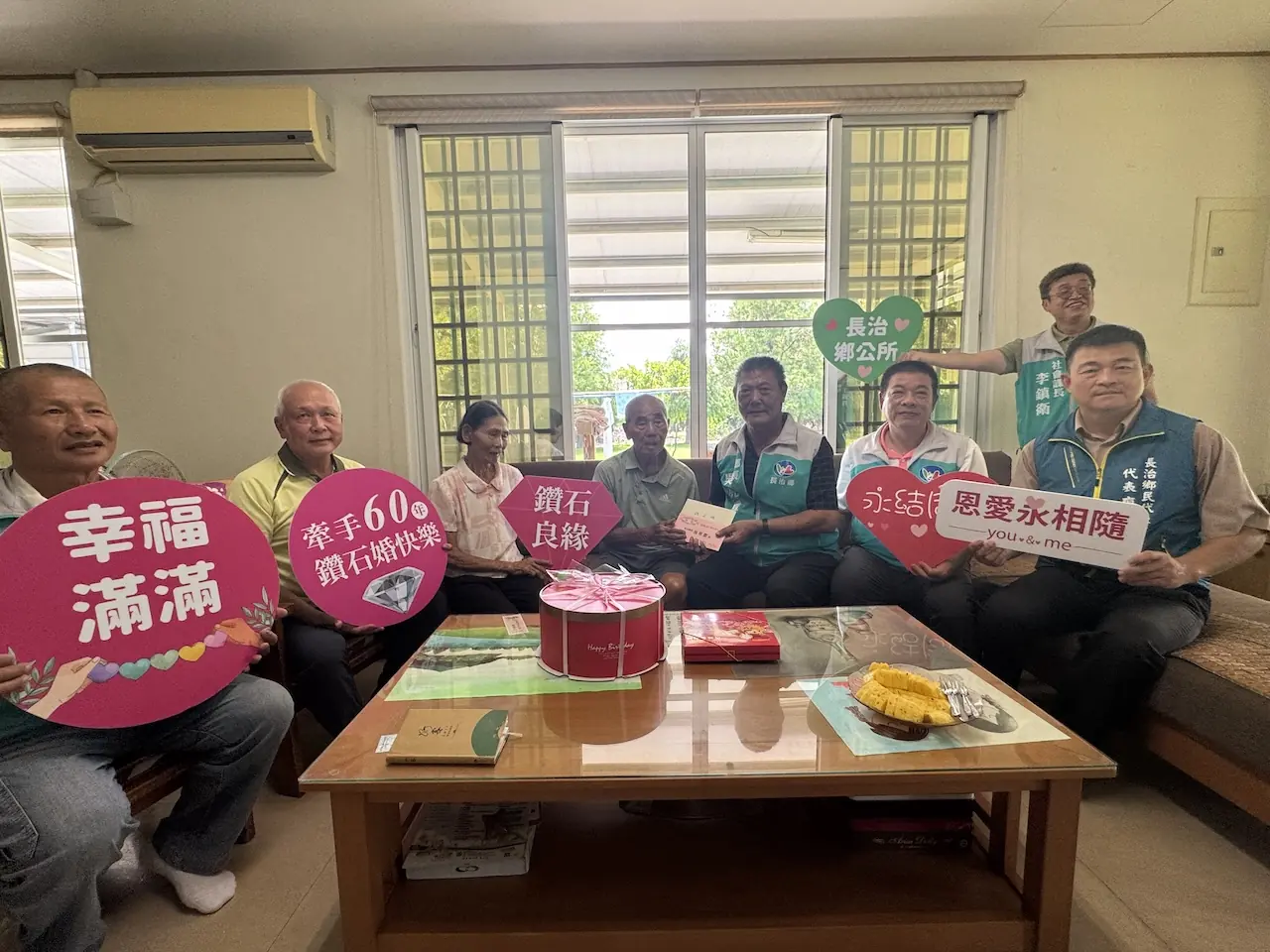 【記者梁秀瓊/屏東報導】長治鄉公所為表彰模範夫妻維繫幸福家庭的精神,推廣孝親敬老與家庭和諧的理念,對於鄉內結婚60年以上「鑽石婚」的夫妻,特地贈與禮券與喜餅,鄉長吳亮慶18日親自到5對模範夫妻家中致上祝福,對於他們辛苦經營家庭的精神十分佩服,稱讚他們才是鄉內「長治久安」的力量。
