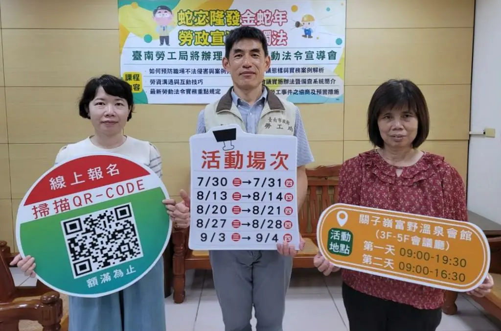 【記者黃潔台南報導】為強化事業單位管理人員、勞工團體與勞資會議代表人員對於勞動法令規範、勞動權益保障及勞資爭議處理機制的瞭解,南市府下半年將於關仔嶺富野溫泉會館辦理五場次「勞動法令宣導會」,19日並舉行宣傳會說明宣導會內容全部免費,歡迎事業單位踴躍報名。