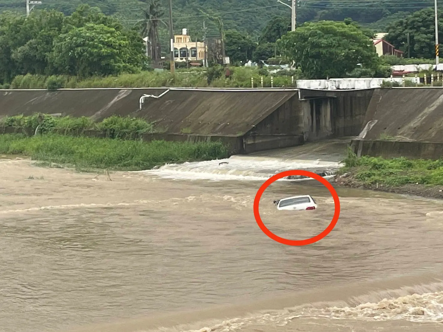 警方於現場協助連繫拖吊車到場,惟業者評估河床水流湍急,待水位退去後再行拖吊。