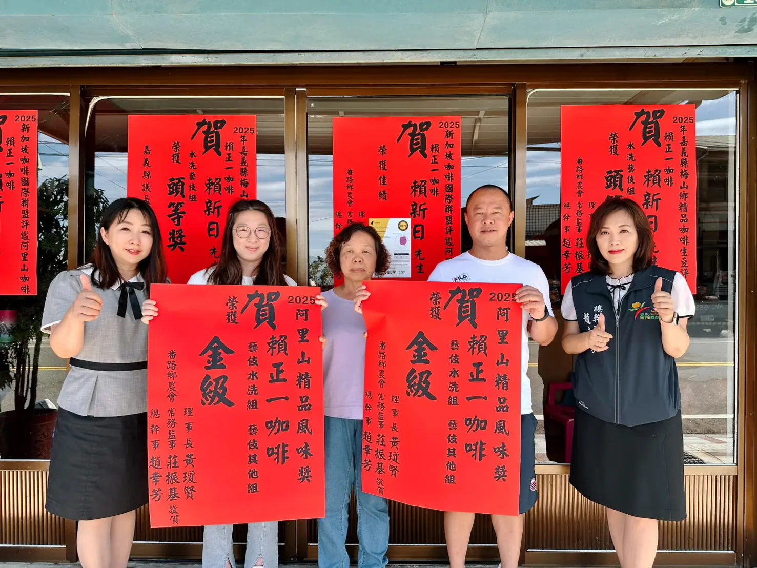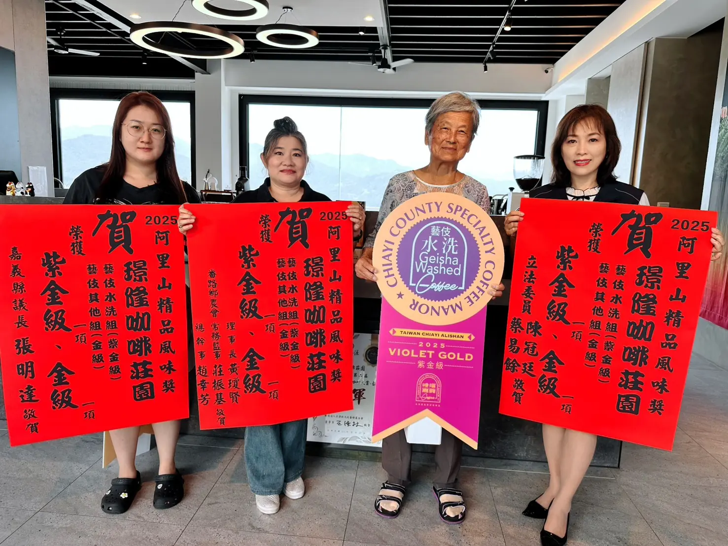 咖啡方面表現同樣出色。在「2025年阿里山精品風味獎」中,部舞、仙井、佳禾、賴正一等多家咖啡莊園皆取得佳績。其中仙井咖啡的蜜處理藝伎豆「花穗的」,在國際咖啡評鑑權威《Coffee Review》中獲得94分高分,風味直追世界頂尖水準;璟隆咖啡勇奪「紫金獎」,珍5吉咖啡莊園更一舉拿下三項金級獎。