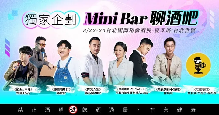 現場《Mini Bar Talk|聊酒吧》即時開播,並邀請擁有百萬流量的厭世派Podcaster《茫Day不錄》、《吐在巷口》的主持人高有翔、呂植宇、楊樹翰,以及冠軍調酒師鄭亦倫(Allen)等多位陣容,以輕鬆深入且犀利風趣的對談,引領觀眾暢談酒場生活、人生哲學與微醺時光;Live Podcast活動名額有限,採預約報名制,歡迎全台酒友一同共赴這場獨一無二的聲音與美酒饗宴。