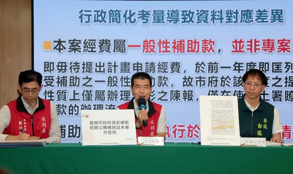 水利局長邱忠川表示,該次調查主軸為監察院對「中央主管機關是否落實地方補助款督導管考」所提出的建議,市府並非被糾正對象;針對市府提報案件與原核定項目不完全一致情況,市府已於調查期間做出說明,因該案經費屬一般性補助款,補助額度於前一年度核列,市府再於該年度提報辦理情形,並非專案工程補助形式;南市幅員廣闊,全市33區公所與水利局每年辦理逾百件清淤工程,部分工程因發包時程、契約文件完成時間不一,未及於年初提報期程時完成招標程序,導致原提報工程與最終執行案件出現差異,但補助額度實際執行內容均為雨水下水道清淤工程,係因行政簡化考量導致資料對應差異。