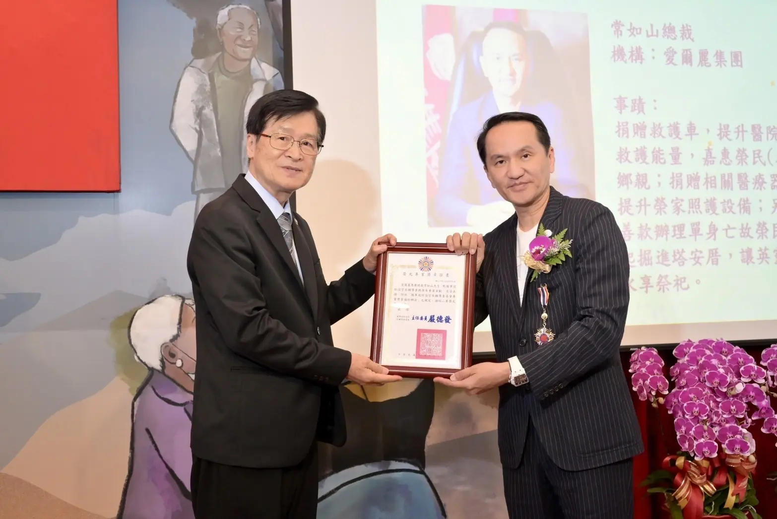 此次典禮共頒發「榮光專業獎章」予4個法人與公益團體、16位退役官兵代表,獲獎單位包括愛爾麗集團、財團法人寶佳公益慈善基金會、新昌營造有限公司等;其中,愛爾麗集團總裁常如山,因長期支持退役軍人福祉,曾捐贈3輛救護車、協助48具花蓮地區單身榮民遺骸撿骨與遷葬事宜,並於疫情期間捐助防疫物資,善行深獲肯定,榮獲114年度「二等榮光專業獎章」。