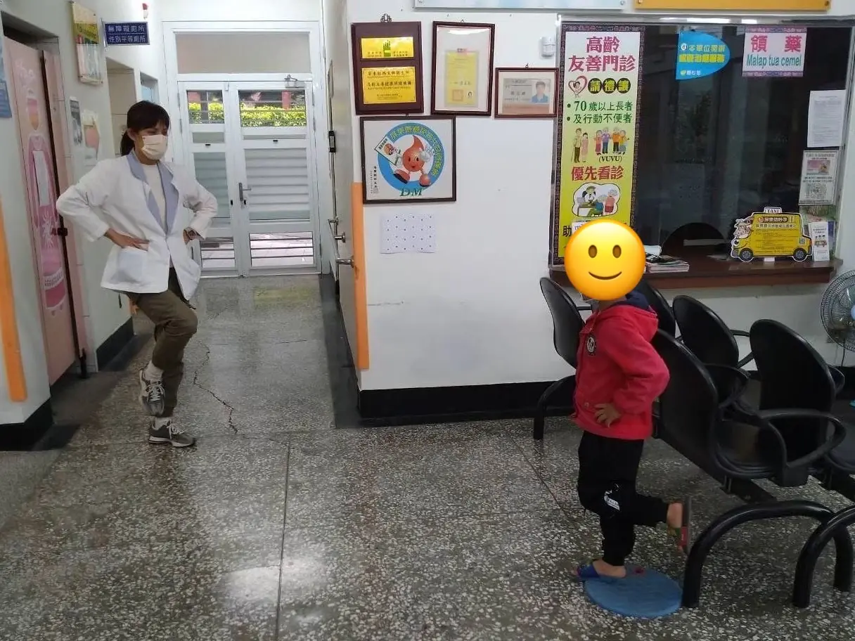屏基醫師進行兒童粗大動作單腳平衡評估。(記者梁秀瓊翻攝)