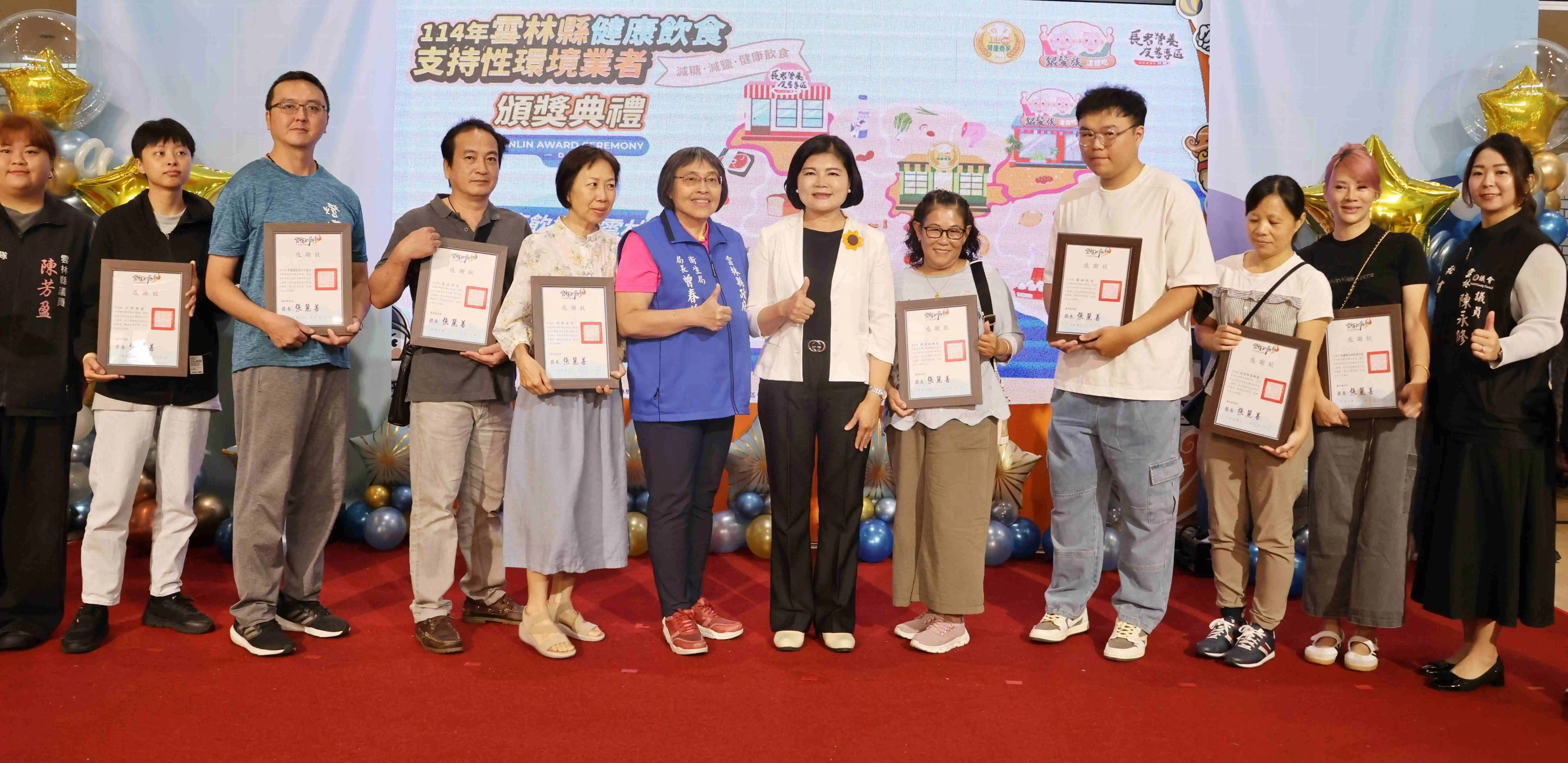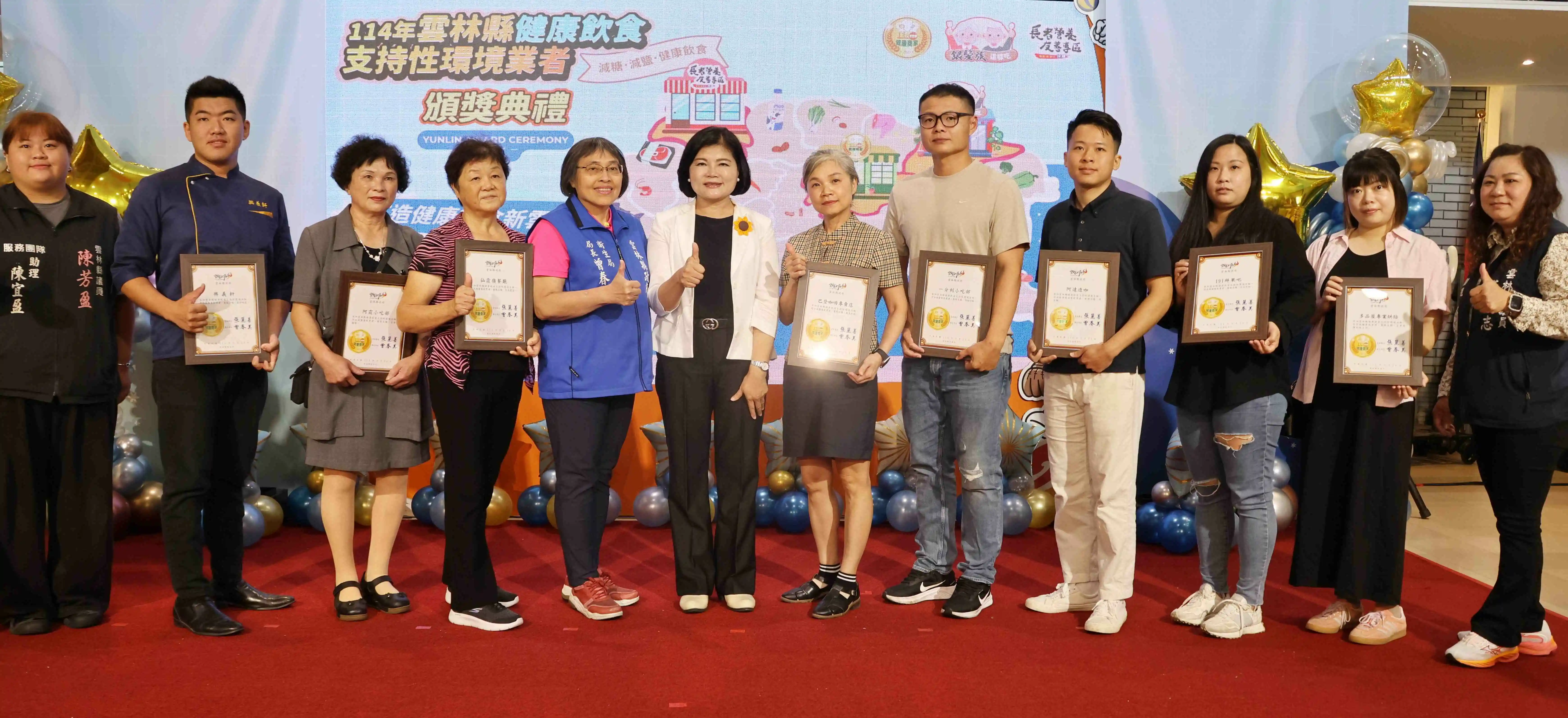 【記者黃金郎雲林報導】雲林縣衛生局為營造健康飲食環境,積極輔導「減糖、減鹽及符合飲食建議」店家,以及推動「銀髮樂食餐」與設置「長者營養友善專區」,縣長張麗善、衛生局長曾春美今(二十四)日上午表揚今年新增52家業者,期盼透過公私協力共同打造健康飲食新雲林,守護縣民的健康。