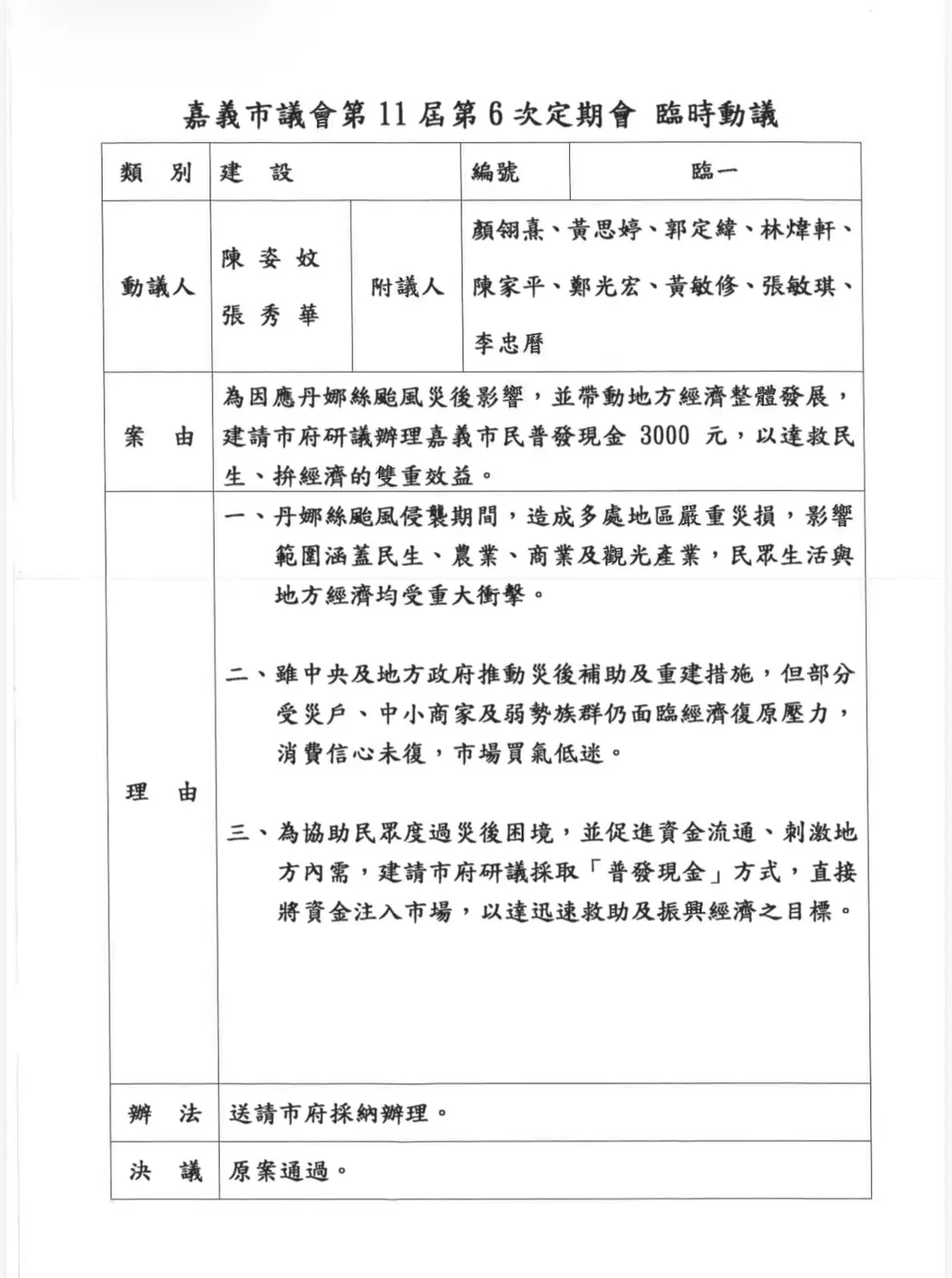 有鑒於新竹市明年也研擬普發現金五千元,市民關切嘉義市是否跟進?陳姿妏與張秀華提臨時動議,獲鄭光宏在內共八位議員附議,提案建請市府利用113年歲計賸餘11億餘元,針對26萬餘市民,普發現金三千元,除共享經濟成果,也共度丹娜絲颱風災情低谷。