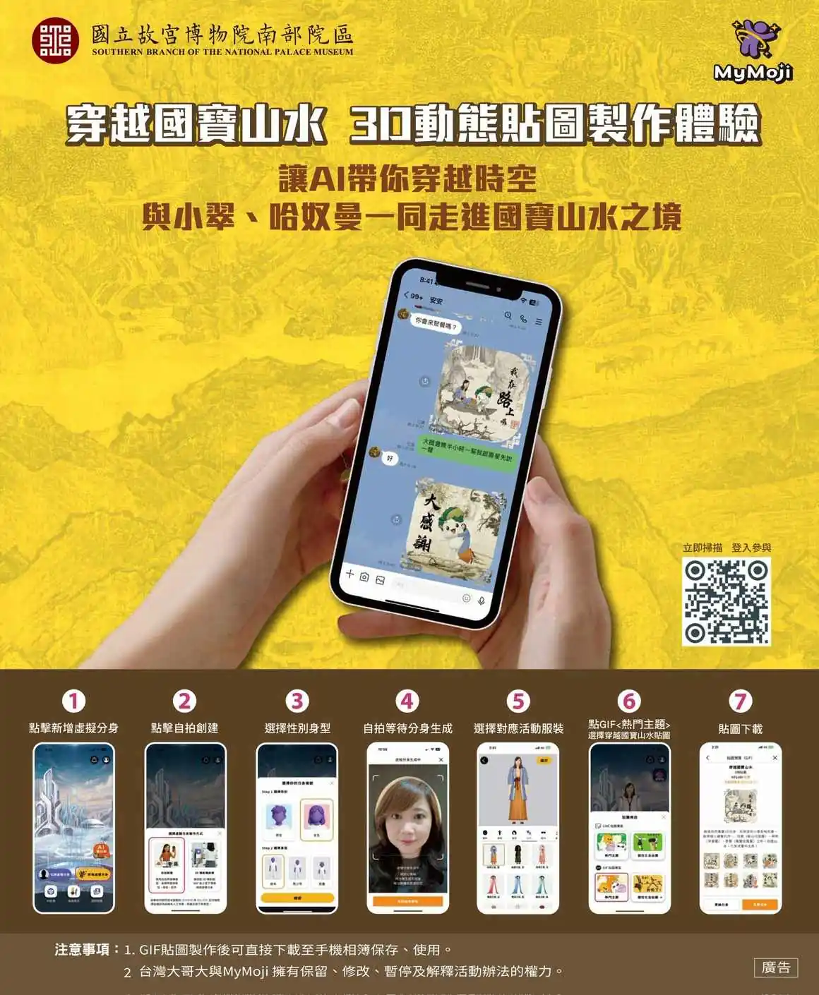 此外,故宮南院特別與台灣大哥大合作推出「MyMoji 3D貼圖」,觀眾掃描QR Code即可化身宋代旅人,走入畫境中,體驗文青風格的動態貼圖樂趣;另外還設計互動心理測驗「關於我成為時空旅人,闖入宋代山水畫的故事」,邀請觀眾化身五種「山水旅人」角色,探索畫中世界;南院更與雷諾瓦合作開發拼圖,並舉辦「國寶拼圖王大賽」,11月16日及12月27日共計4場次,邀請觀眾組隊挑戰,在拼合過程中細賞北宋山水之美。