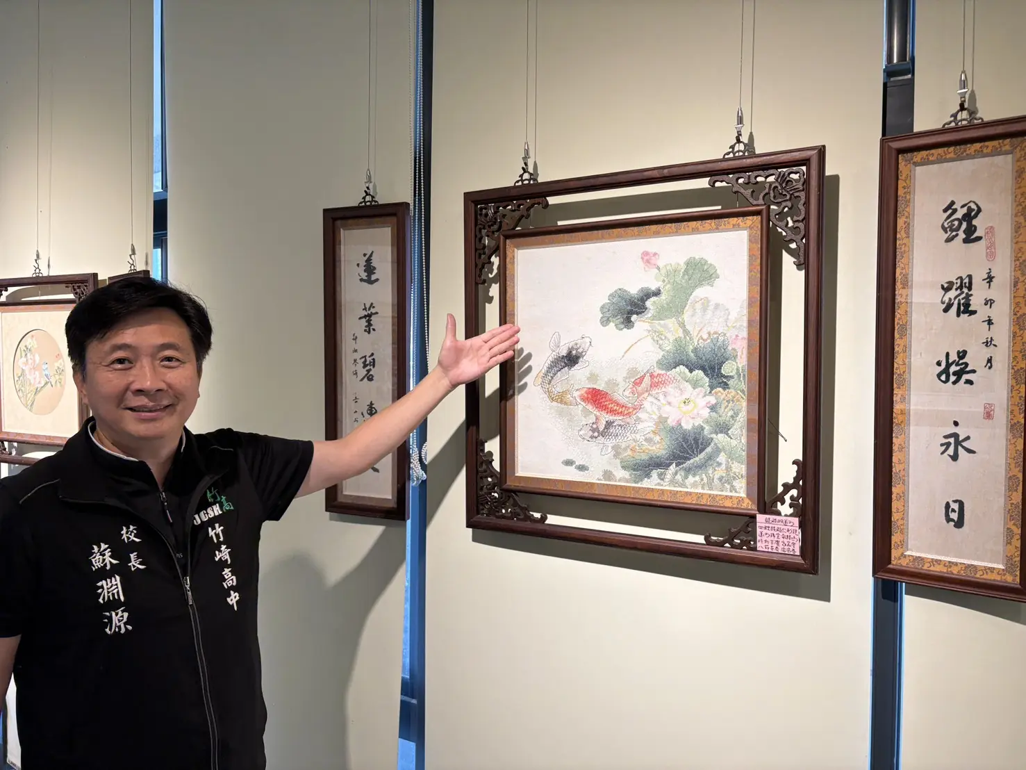 鄭淑琴曾在創校9週年致贈以校徽創作的刺繡作品,事隔11年再度回到新港藝高舉辦展出,她表示,此次展出作品中,以鳥與錦鯉作品,代表祝福學生在校學習直到畢業外出發展,再雙雙對對成家並出人頭地的心意。