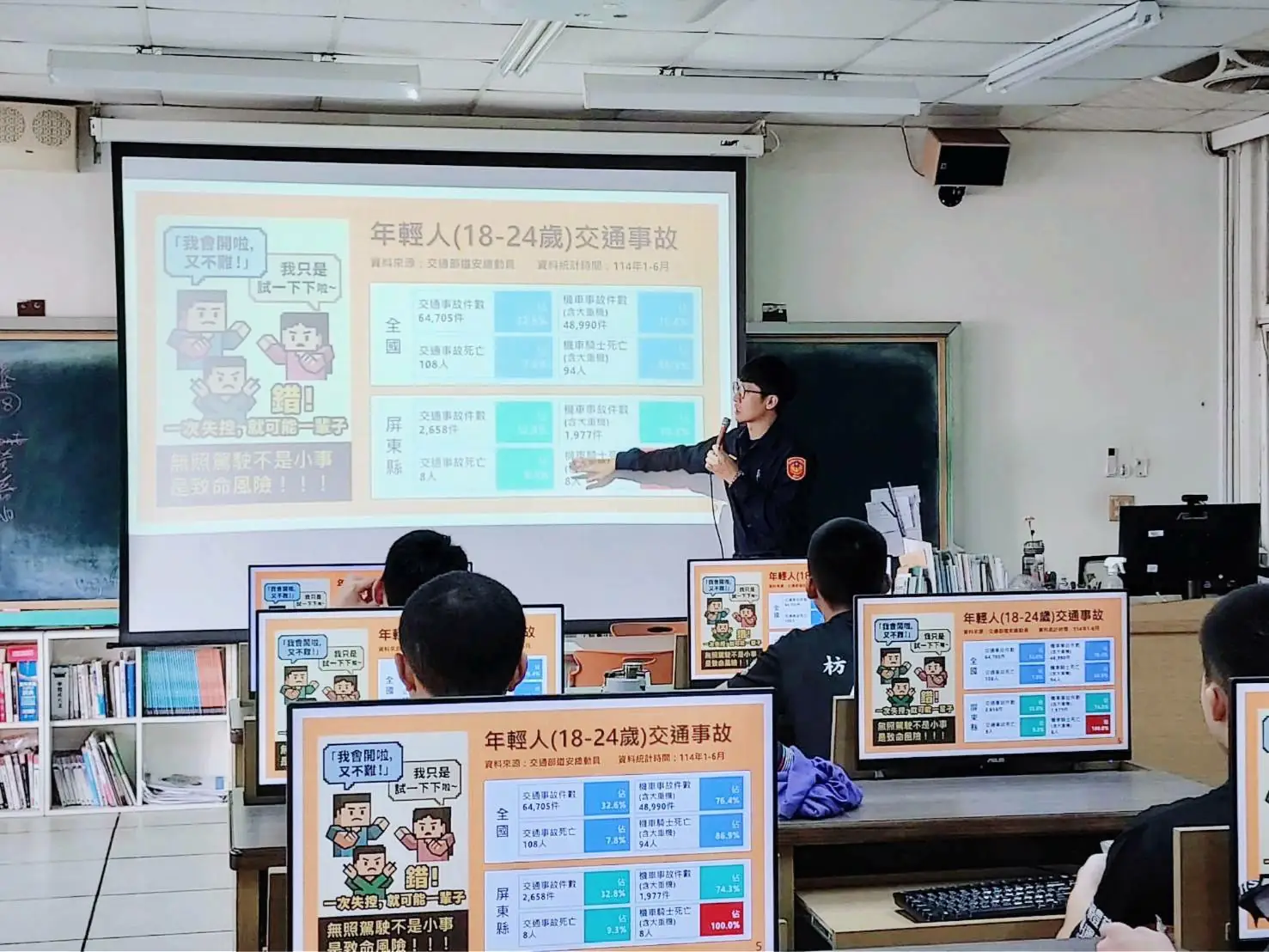 枋寮分局交通組以詳盡的簡報資料,並搭配實際交通事故案例影像,讓學生們了解事故防制採取措施,避免成為車禍的當事者。現場以互動問答與有獎徵答方式,讓學生在輕鬆氛圍中學習交通知識。