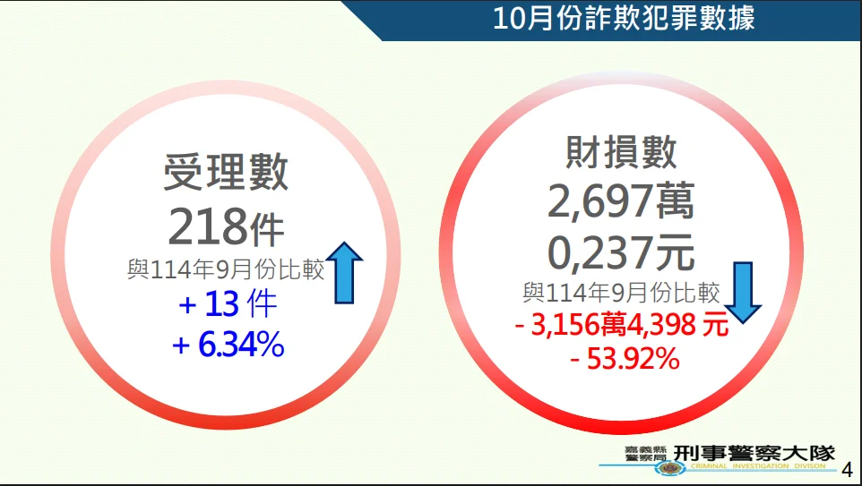 在詐欺犯罪發生趨勢部分,根據打詐儀錶板分析,嘉義縣今年10月份詐欺案件受理數218件,財損金額新臺幣2,697萬0,237元,與114年9月份數據相比較,受理件數增加13件(+6.34%)、財損金額減少3,156萬4,398(-53.92%);網路購物詐騙案件已有明顯竄升趨勢,位居高發案類冠軍,惟投資詐騙(含假交友投資)在財損部分依然位居各類手法首位,占財損總額64.01%,提醒民眾投資前務必謹慎查證,切勿輕信不實廣告,以免誤墜詐騙陷阱!