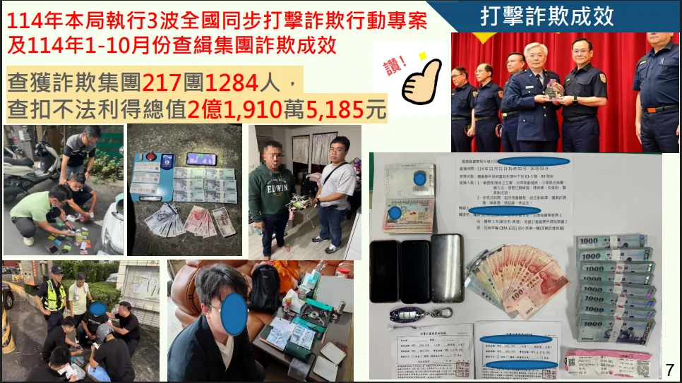 在打擊詐欺犯罪部分,114年該局執行3波全國同步打擊詐欺行動專案及114年1至10月份